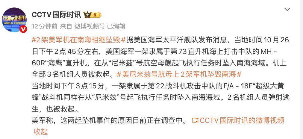 当地时间下午3点15分亿配资,一架隶属于第22战斗机攻击中队的F/A-18F“超级大黄蜂”战斗机同样在从“尼米兹”号起飞执行任务时坠入南海海域。2名机组人员弹射逃生,也被救起。美军称,这两起坠机事件的原因目前正在调查中。