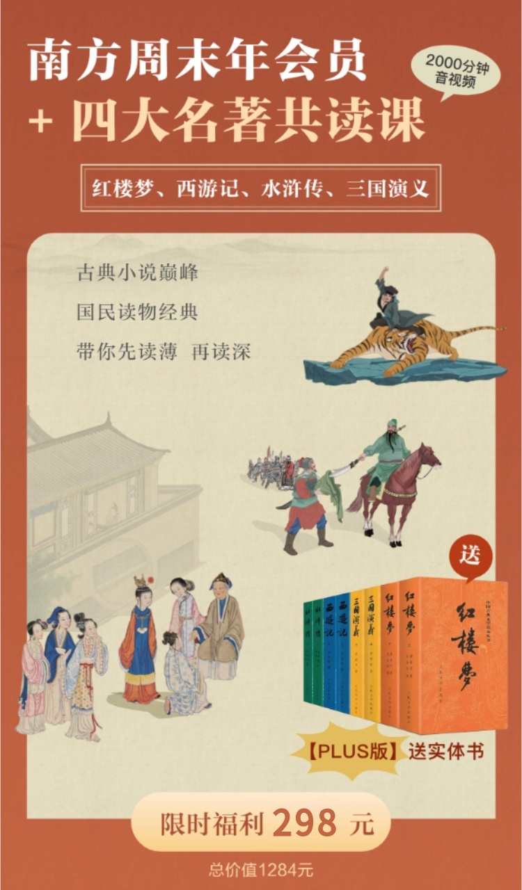 相对于市面上动则五六百元的同类课程,我们还额外提供了巨额补贴,购买此次共读课的读者不仅有特价优惠,还可以一次性带走南周会员年卡+四大名著全套人文社经典版纸质书。