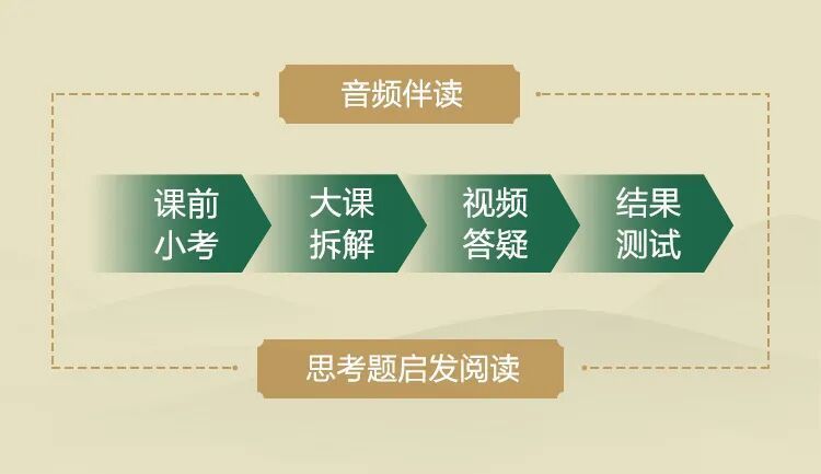 先来看看课程的内容组成:2000分钟视频、音频,16节视频大课专题解读,56条音频全程伴读,8节讲师答疑视频,每本书一套脉络说明图,每本书课前课后闭环测试卷……几大板块组合成一套完整的学习方法。