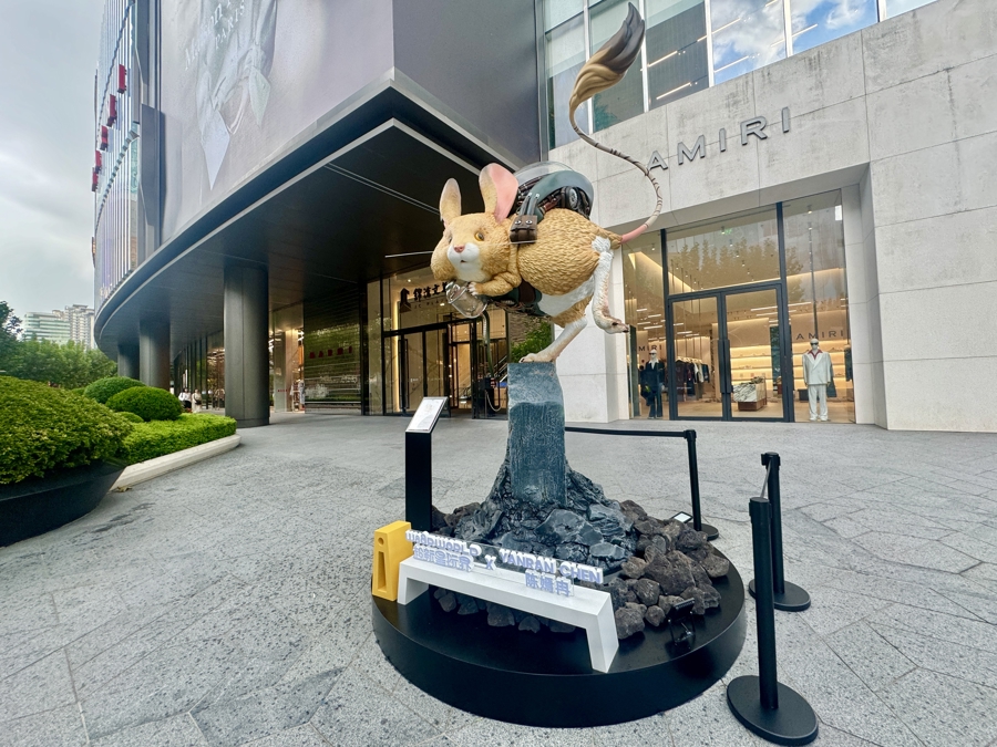 作为本次快闪的核心灵魂,陈嫣冉为锦沧文华广场量身打造的“超序之地·引水兽沙鼠”装置,以3.6米的庞大身躯矗立于户外西侧广场,成为连接过去与未来的视觉奇点。